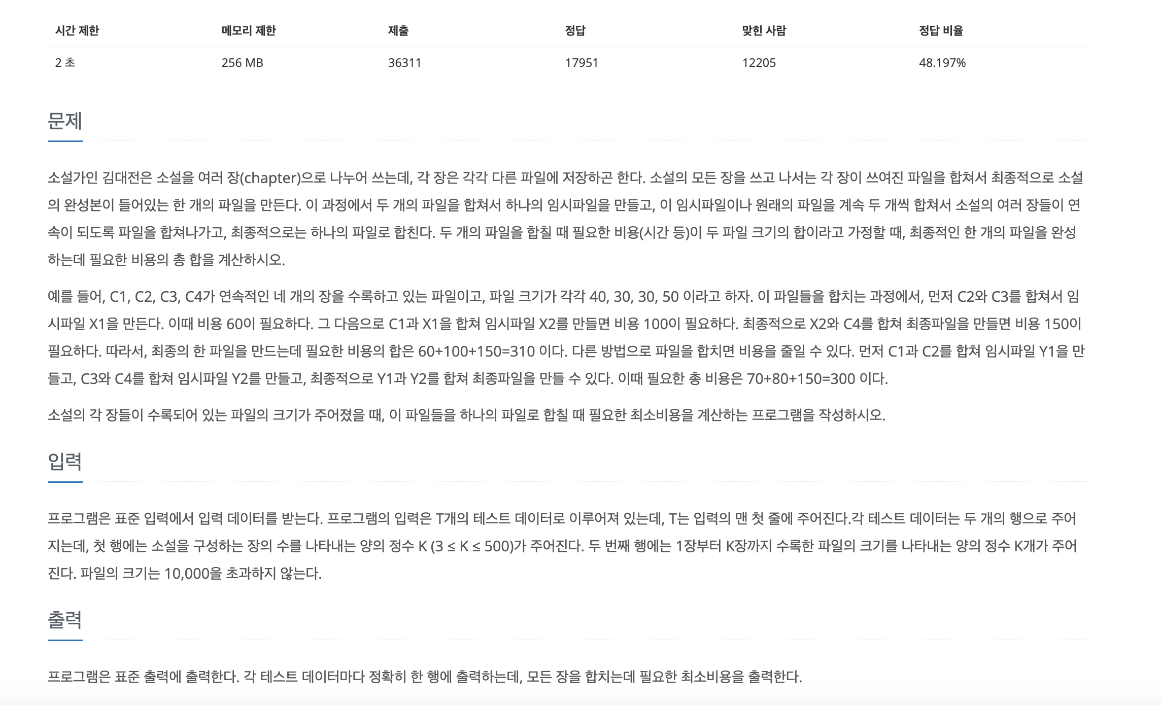 이 문제는 여러 개의 파일을 순서대로 합칠 때, 최소 비용을 구하는 문제이다. 연속된 파일들만 합칠 수 있다는 점에서 동적 계획법이라는 힌트를 얻을 수 있다.