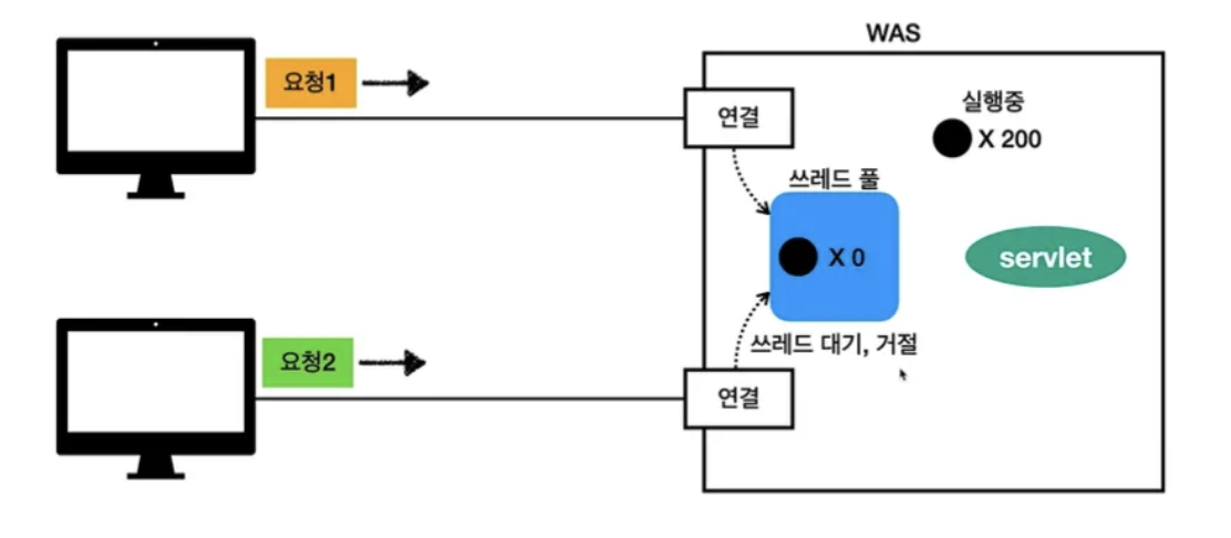 WAS는 스레드 풀에 여러 스레드를 미리 생성해두고 요청이 들어올 때마다 할당하고 반환하는 과정을 거친다.