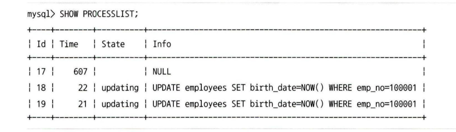 17번 스레드는 트랜잭션을 시작하고 update 명령이 실행 완료된 것이다. 하지만 아직 commit 을 실행하지 않은 상태이므로 업데이트한 레코드의 잠금을 그대로 가지고 있는 상태이다. 그리고 18번, 19번 스레드가 잠금 대기로 인해 아직 update 명령을 실행 중인 것으로 표시된 것이다.