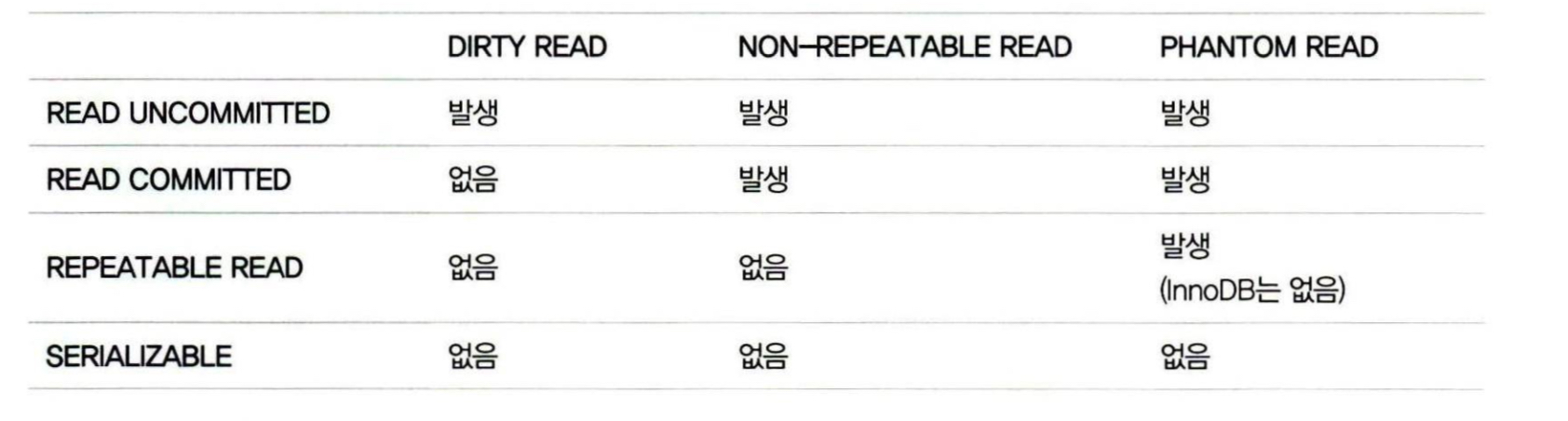 "DIRTY READ"라고도 하는 READ UNCOMMITTED는 일반적인 데이터베이스에서는 거의 사용하지 않고, SERIALIZABLE 또한 동시성이 중요한 데이터베이스에서는 거의 사용되지 않는다.