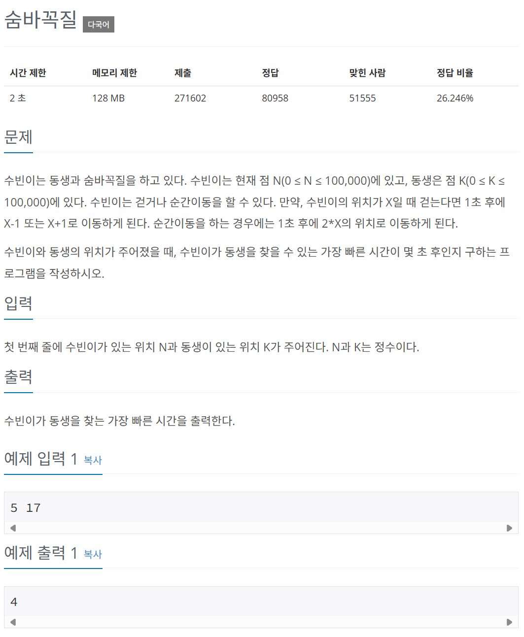 수빈이는 x-1, x+1, 혹은 2*x로 이동할 수 있다. 완전 탐색으로 답을 찾아가지만, 이미 방문했던 위치는 다시 탐색할 필요가 없으므로, 방문한 위치를 저장하는 배열이 필요하다. 또한, 최단 시간을 저장해야하므로 queue에 위치와 시간을 담은 튜플을 저장하였다.