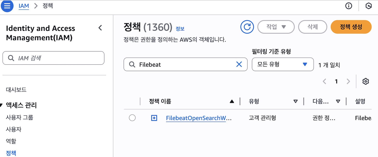 Filebeat가 OpeanSearch Service에 데이터를 쓸 수 있는 권한을 정의하는 IAM 정책을 생성한다.