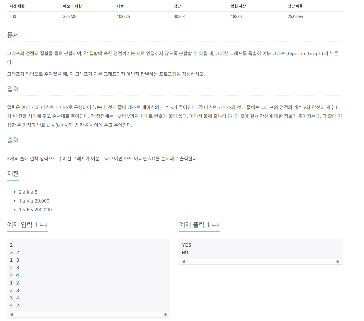 static int[] colors; // 0: 방문 안 함, 1: 그룹1, 2: 그룹2