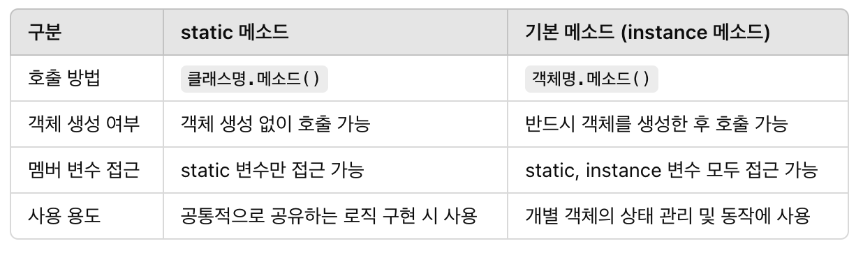 - static 변수와 메소드는 프로그램이 종료될 때까지 메모리에 유지되므로, 너무 많은 static을 남용하면 메모리 낭비로 이어진다.