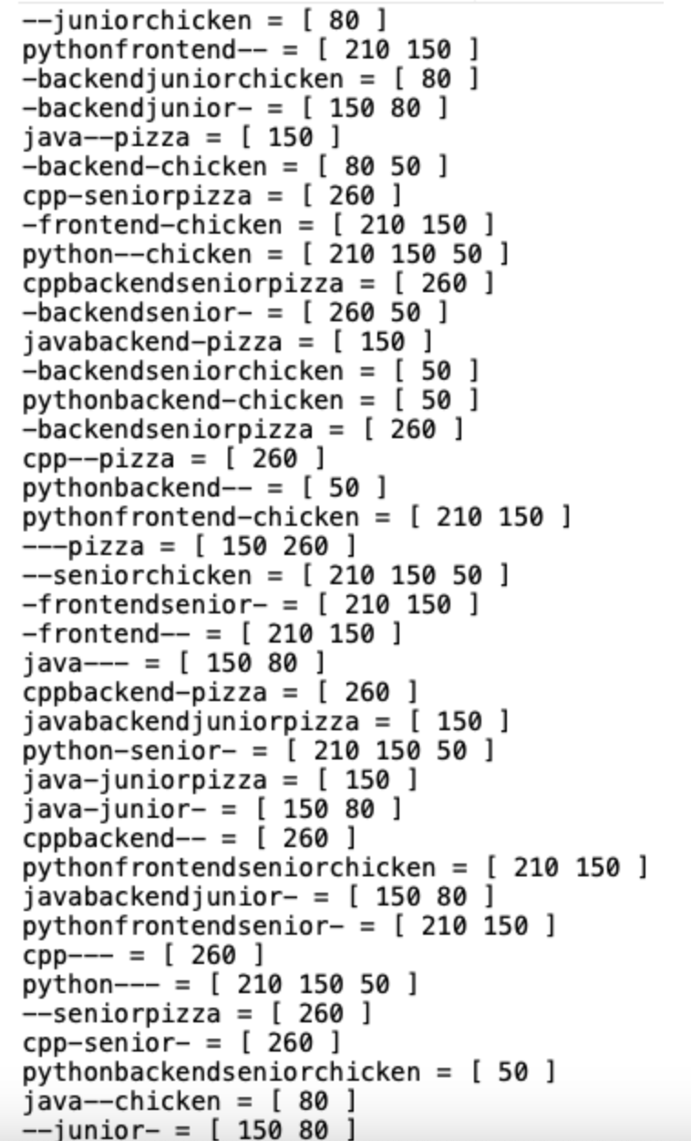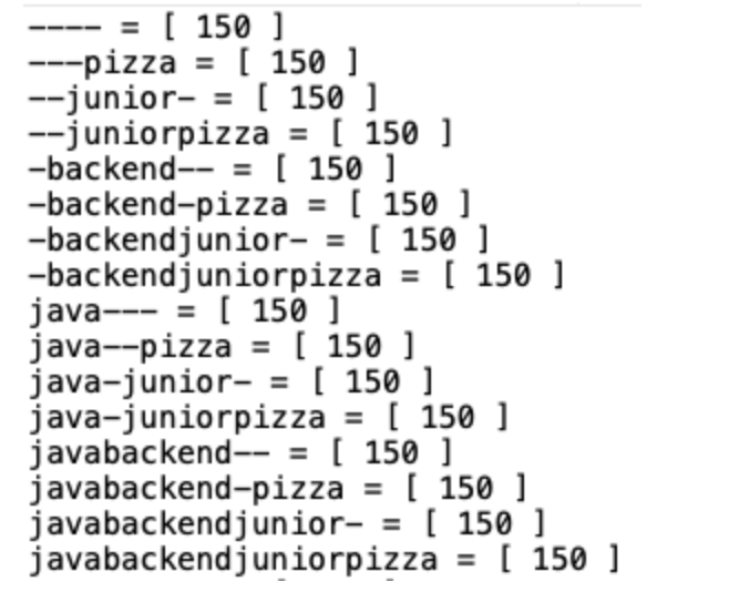 ex) ["java", "backend", "junior", "pizza", "150"]는 아래의 모든 경우에 해당되므로, 점수를 넣어준다.