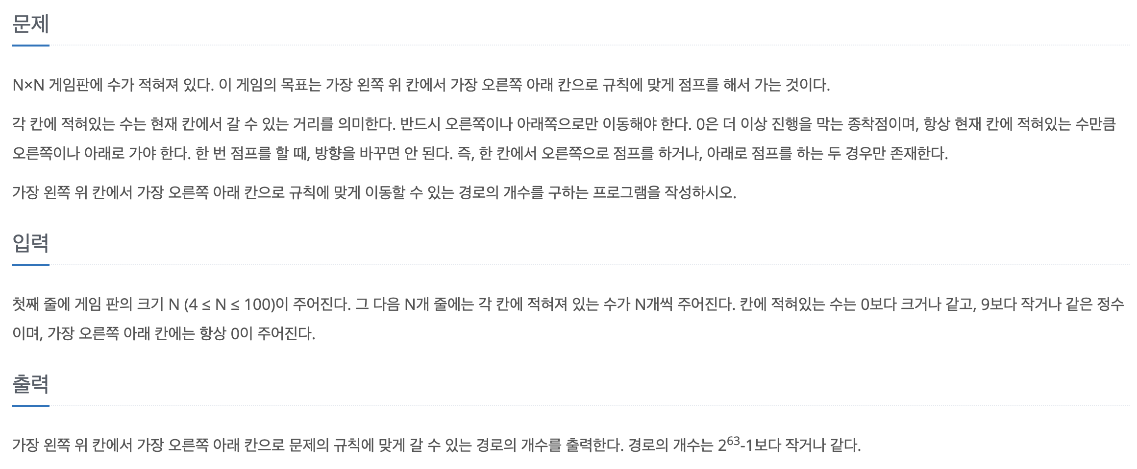 처음에는 단순히 백트래킹(DFS) 방식으로 (0, 0)부터 도착점 (N-1, N-1)까지 이동할 수 있는 모든 경로를 재귀적으로 탐색했다. 그런데 특정 좌표에 여러 경로로 도달할 수 있기 때문에, 같은 위치를 중복해서 수십, 수백 번 다시 탐색하게 되었고 결국 시간 초과가 발생했다.